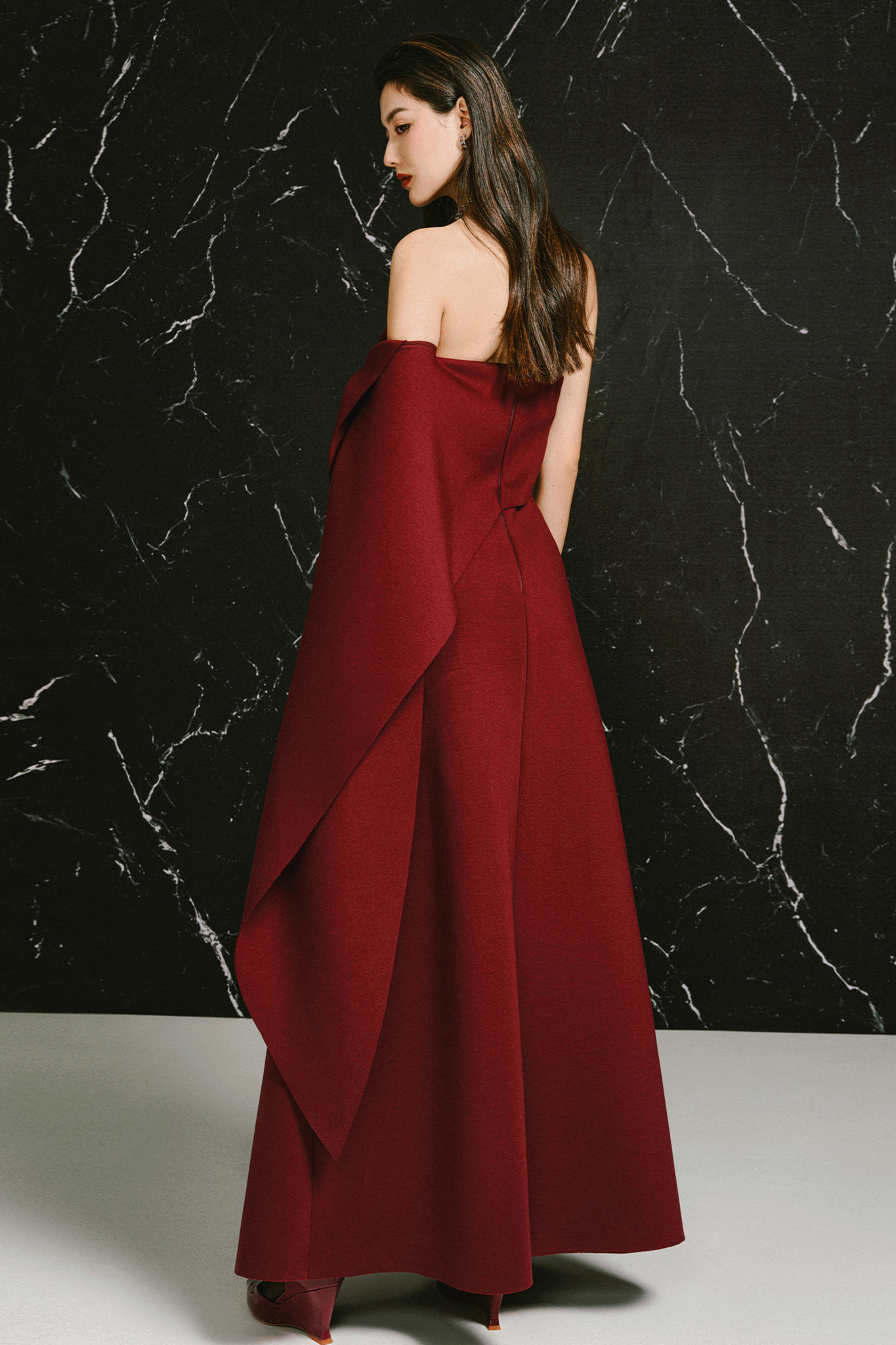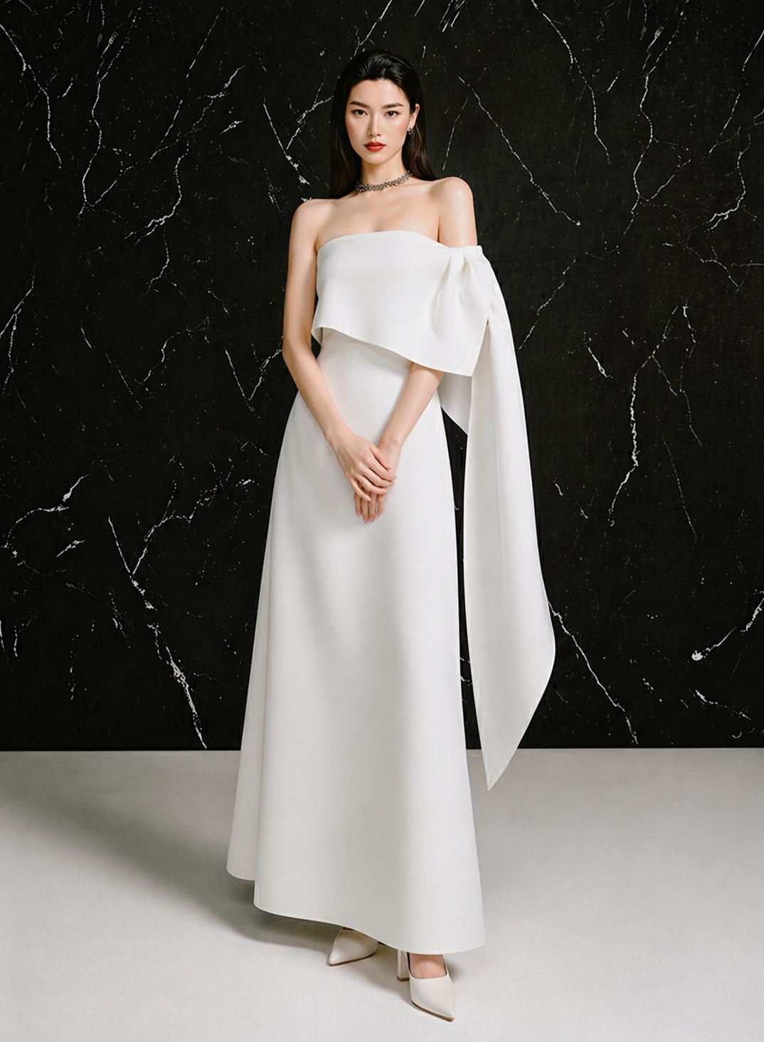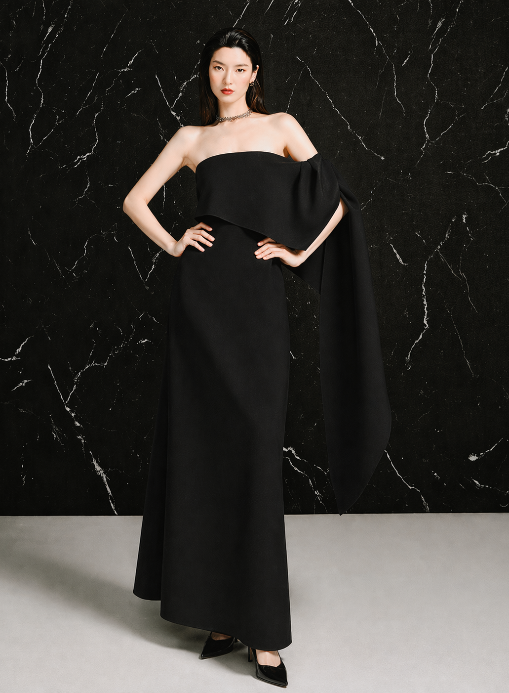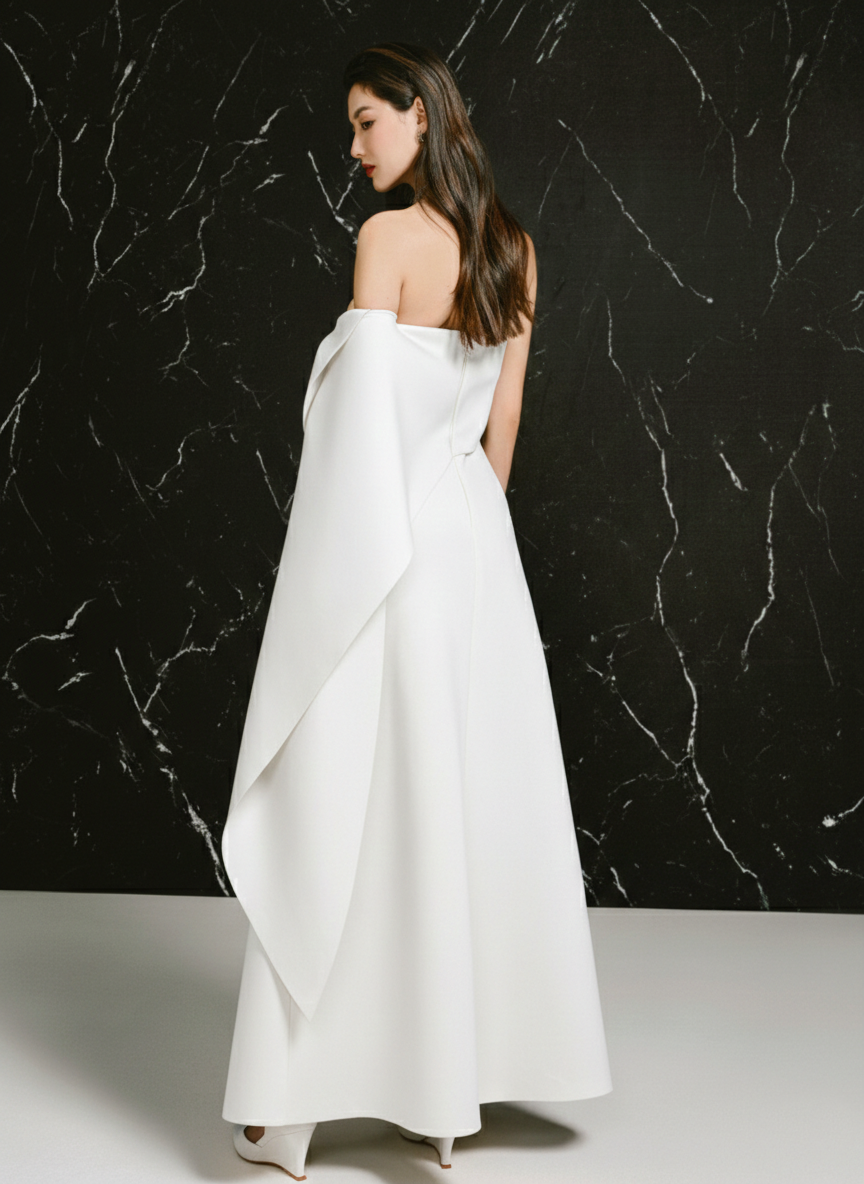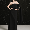 Strapless midi dress with a twisted draped detail on the left sideCenter back zipper closureCenter back length for sizes S/M/L: 51 / 52 / 53 cmArmhole for size S/M/L: 17/ 18 / 19 cm