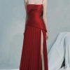 Midi dress, visually combines a spaghetti strap cami top with a pleated skirt featuring a high slit. Lined at the upper bodice and central back zipper closure. Center back length for sizes S/M/L: 108/109/110 cm.