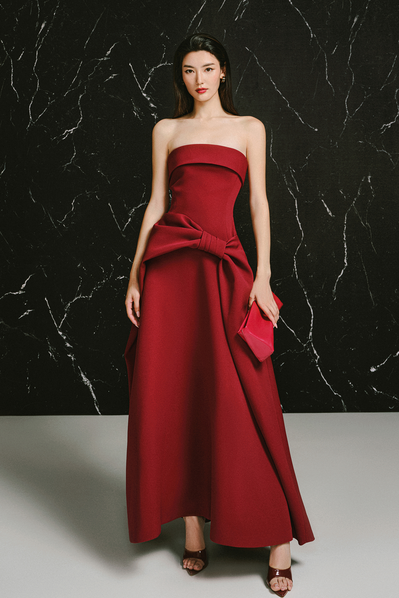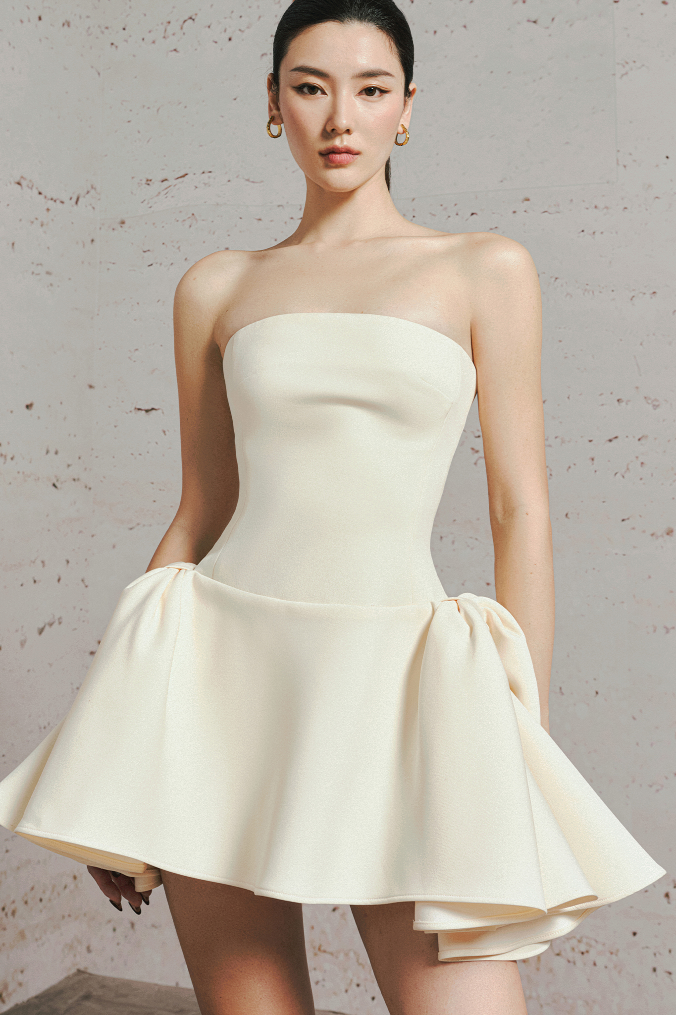 Strapless midi dress with structured bow details over skirtHidden zipper at the lower back Central front length on size S/M/L: 60.5 / 62 / 63.5 cm